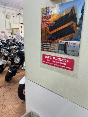 当店で車検・点検(125㏄以上)を受けていただき店頭の応募券で応募していただくと抽選で整備ギフト券が当たります。