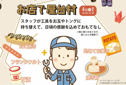 初日の4日は恒例のお客様感謝祭を開催します。お店を屋台村にしてスタッフ総出で振る舞います。